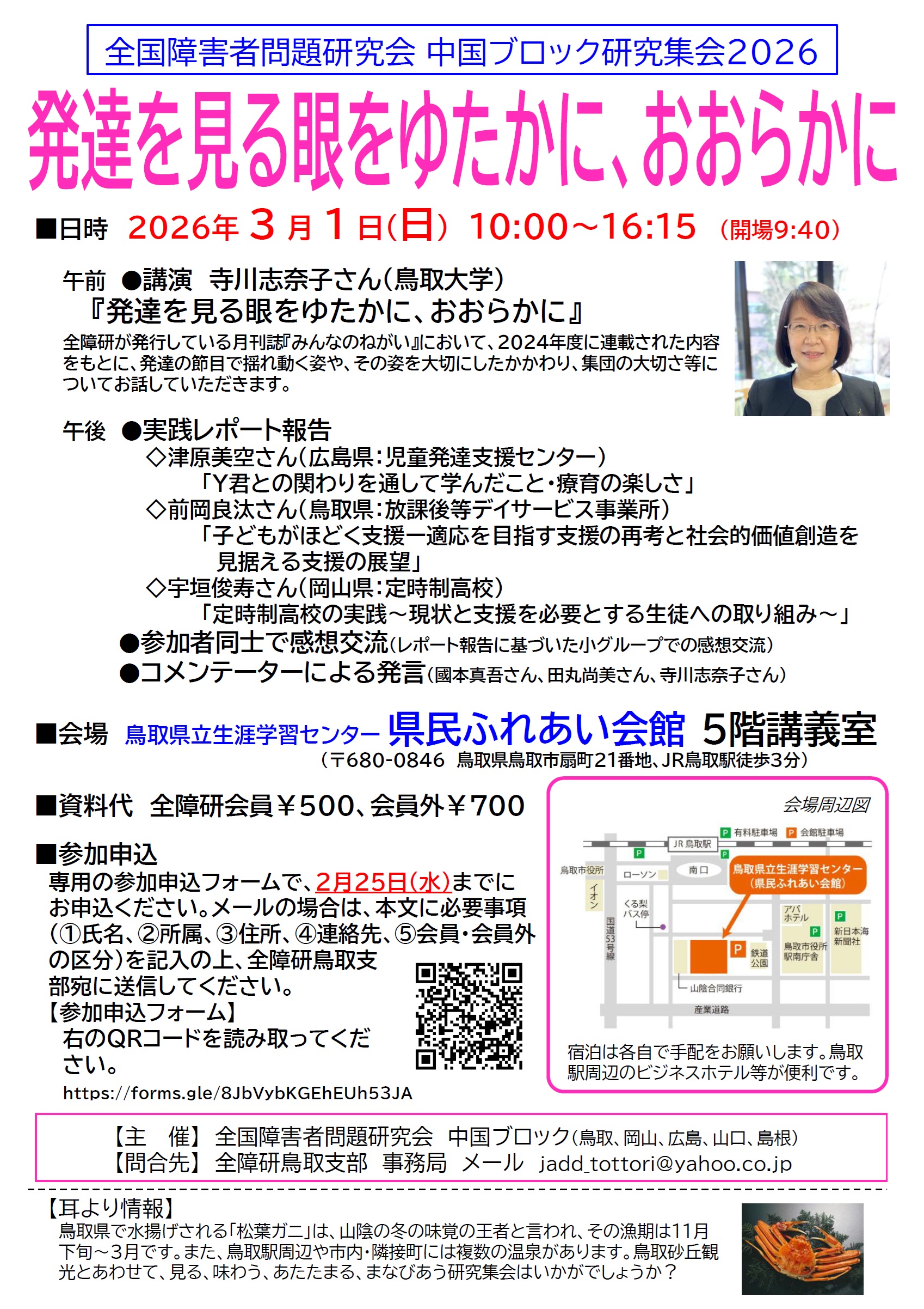 お知らせ 全障研中国ブロック研究集会(2026.3.1開催) 中国地方の全障研各県支部が持ち回り開催のブロック研究集会が、12年ぶりに鳥取で開催されます。会員同士の交流が目的のブロック研究集会ですが、非会員の方や中国ブロック外からのご参加も歓迎します。「お知らせ」のページから詳細をご確認ください。 お知らせを見る